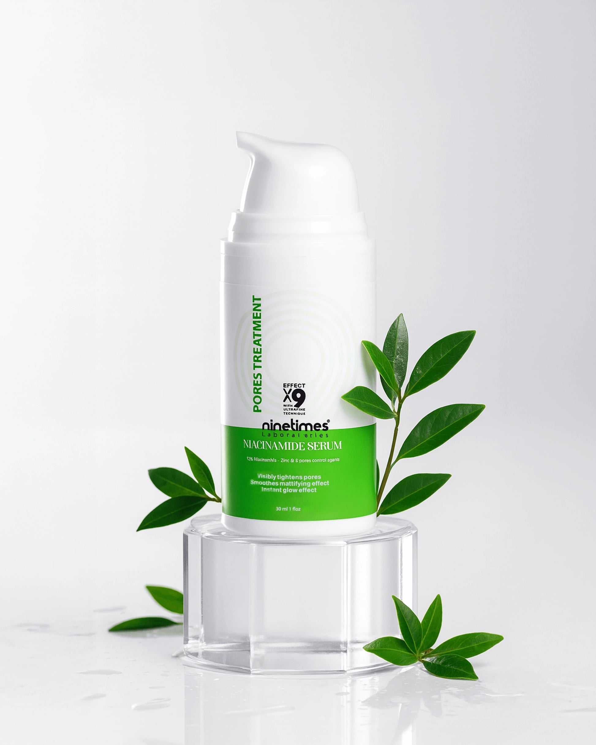 سيروم النياسيناميد من ناين تايمز بتركيز 10% ومادة الزنك لتنظيم افراز الدهون في المسام الواسعة تضييقها 89%، واعطاء البشرة مظهر مشدود ومنع ظهور حبوب البشرة الدهنية.
